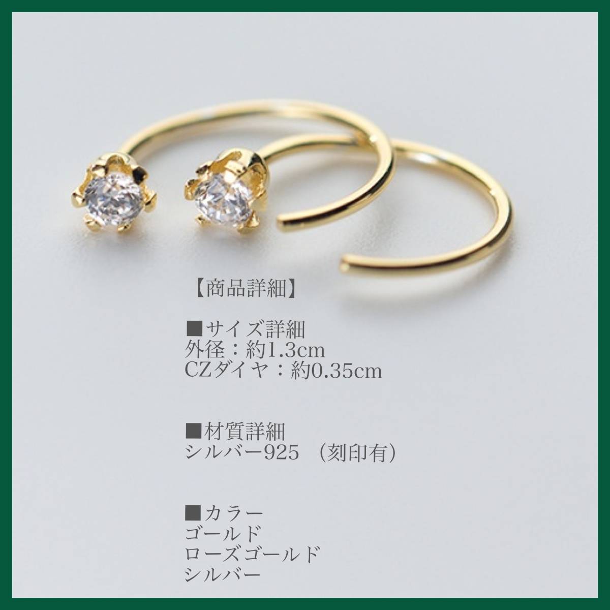 【商品詳細】■サイズ詳細外径:約1.3cmCZダイヤ:約0.35cm■材質詳細シルバー925 (刻印有)■カラーゴールド【発送について】・ご注文から2日以内に対応いたします。・ネコポスもしくはクリックポストにて投函します。・発送後、追跡番号をご連絡いたします。・緩衝材付き封筒に入れて発送致します。【梱包品】・ピアス(両耳用)・ピアスキャッチ(スタッドピアスのみ付属)・専用収納ケース・OPP袋・ブランドロゴ入りゴールドシール付※商品画像については、モニターによって色味が若干異なります事ご了承ください。※アレルギーの方にも比較的安心してご使用いただけます。必ず金属アレルギーがでないということではございません。p098-g