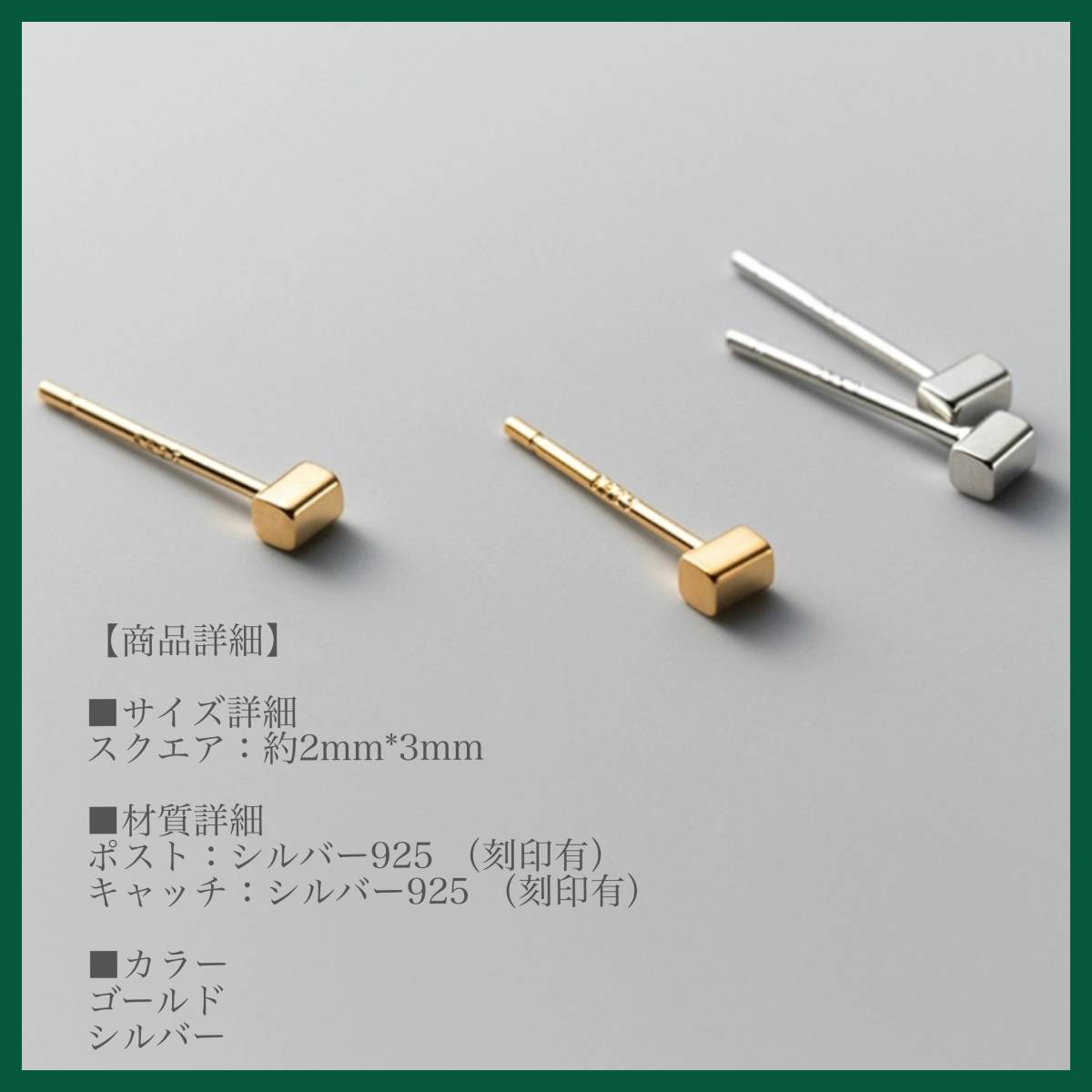 【商品詳細】■サイズ詳細スクエア:約2mm*3mm■材質詳細ポスト:シルバー925 (刻印有)キャッチ:シルバー925 (刻印有)■カラーシルバー【発送について】・ご注文から2日以内に対応いたします。・ネコポスもしくはクリックポストにて投函します。・発送後、追跡番号をご連絡いたします。・緩衝材付き封筒に入れて発送致します。【梱包品】・ピアス(両耳用)・ピアスキャッチ(スタッドピアスのみ付属)・専用収納ケース・OPP袋・ブランドロゴ入りゴールドシール付※商品画像については、モニターによって色味が若干異なります事ご了承ください。※アレルギーの方にも比較的安心してご使用いただけます。必ず金属アレルギーがでないということではございません。p100-s